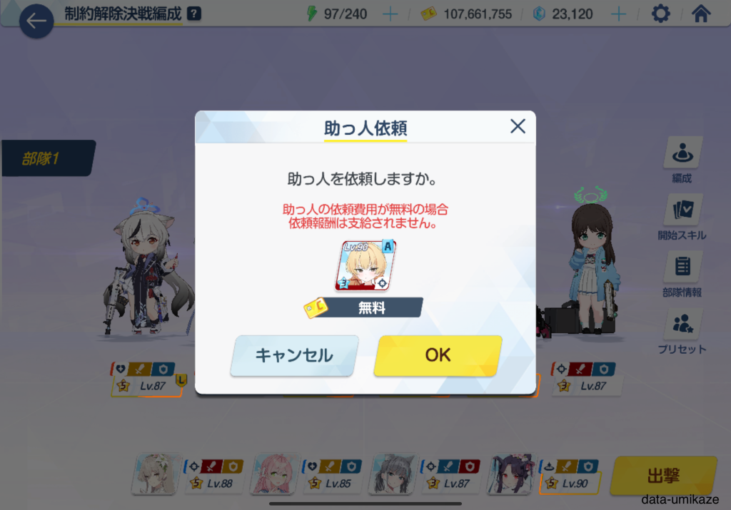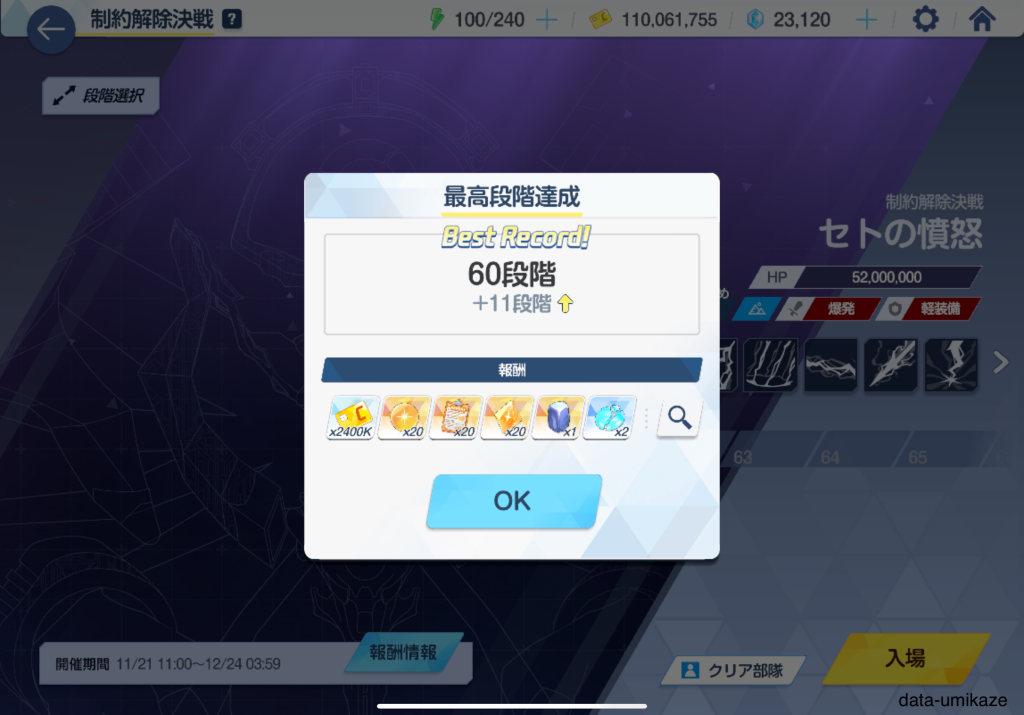 60階にチャレンジして、何度かリトライして無事にクリア。本当にギリギリだったので、これより上を目指すなら生徒の強化や編成の調整が欠かせないだろう。