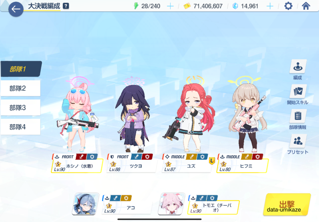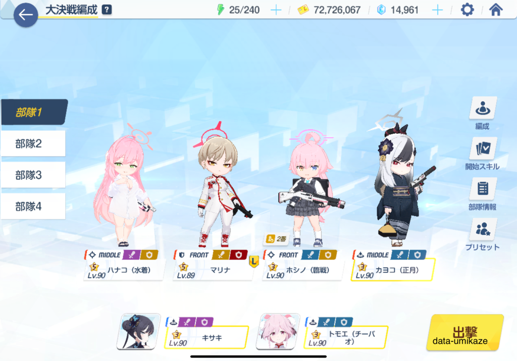 ただしホシノとハナコが装甲不利、正月カヨコが等倍ということでタンク役のマリナの位置次第であっという間に部隊が壊滅する。ホシノが重装甲ということに途中まで気づいていなかったのは内緒だ。