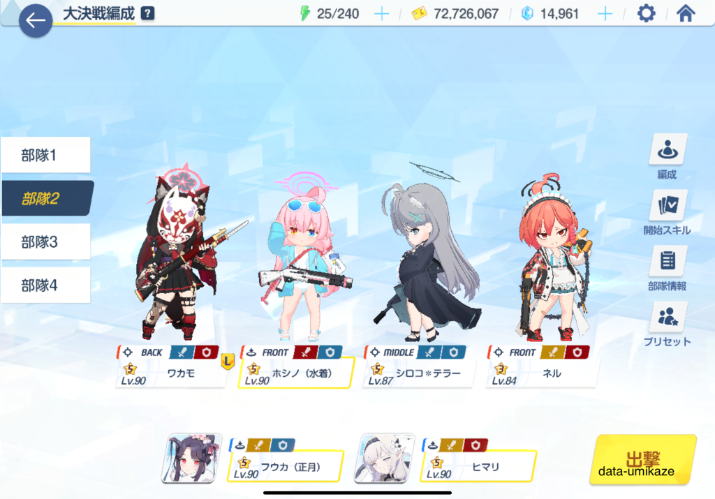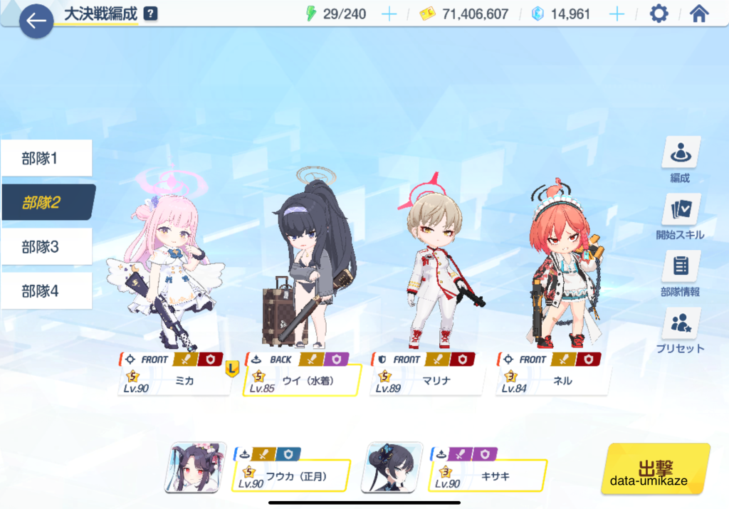 正月フウカのコスト半減が活きるメンバーではないものの、アコだとワカモと相性が良くないのもあって消去法で選出。1部隊目のキサキと2部隊目の正月フウカは交代したほうが良かったかもしれない。
