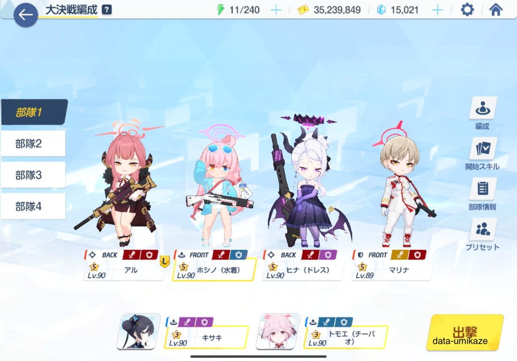臨戦ホシノと水着ハナコを強化し、チーパオトモエで位置調整したカイテンジャー達にEXを打ち込む作戦。