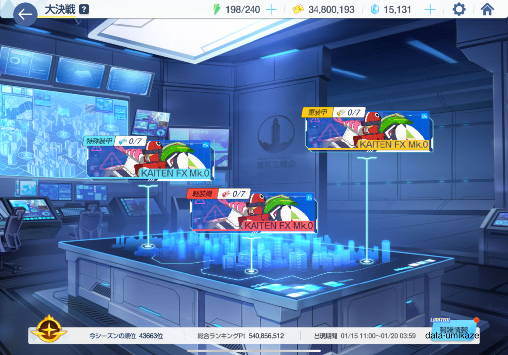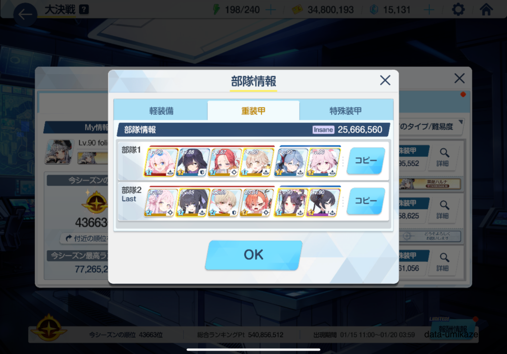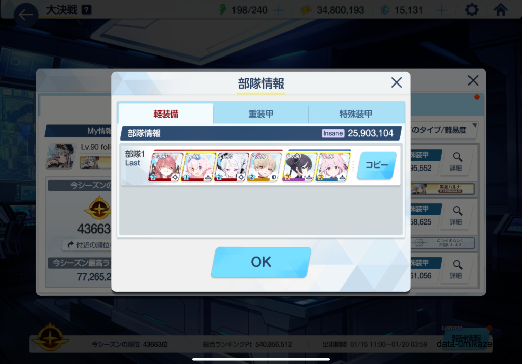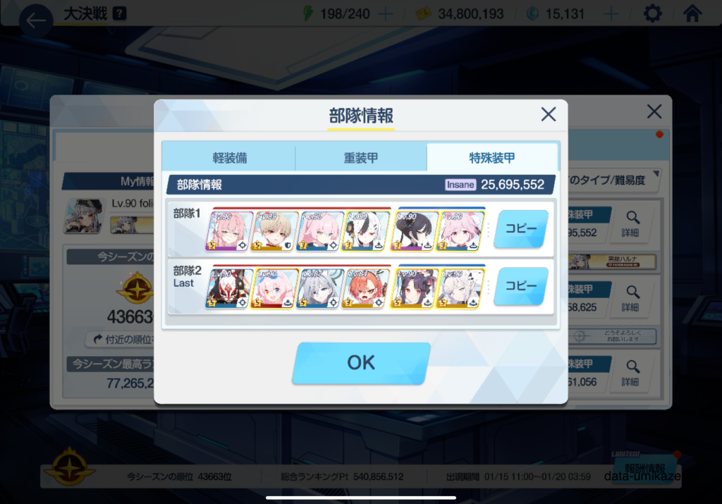 2025/01/15~2025/01/20の期間に開催されている大決戦カイテンジャー。軽装備はINSANE1凸、重装甲と特殊装甲はINSANE2凸で攻略した。