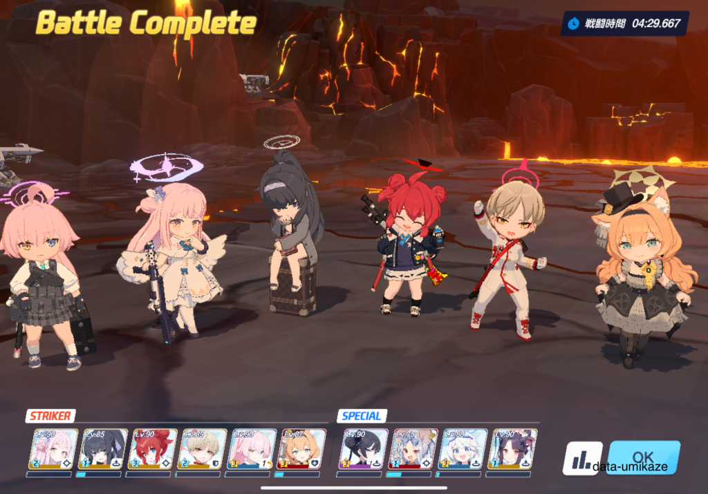 後半戦のお皿シールドに対抗できる生徒を編成していないため、上振れて早めに前半戦を終えてもカイテンジャーの行動次第では早めに撤退する予定だった。まあ前半戦を時間ギリギリで突破したので杞憂に終わったが。