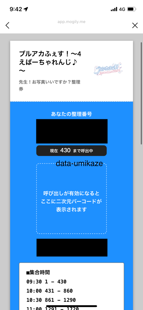 昨年のブルアカふぇすでは、確か物販や「先生!お写真いいですか?」の整理券を取得するためには一度会場の指定場所でQRコードを読み取るという手間があったのだが、今回はパンフレットについているQRコードからLINE上のアプリを起動し、ボタンを押すだけで整理券を取得できる。
