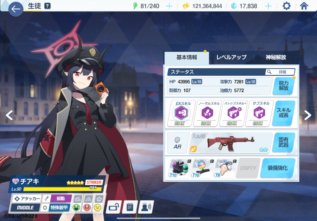 とはいえ水着ハナコ編成は弱点をつかれるため前回ひどい目に遭い、より適正の高いメイドモモイとメイドミドリは星3で全く育成できていないため、すでに固有2まで育てたチアキ主体で通す方が楽だろうと考えた。