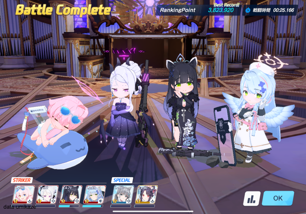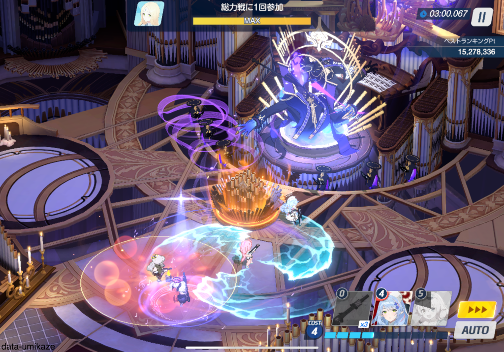 ミネでデバフをばら撒き、ドレスヒナにバフを集めて撃ち抜く編成。カメラ移動前に突破できる。