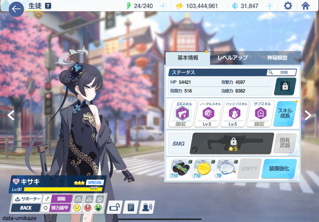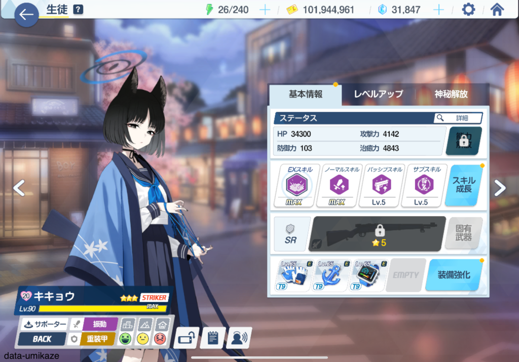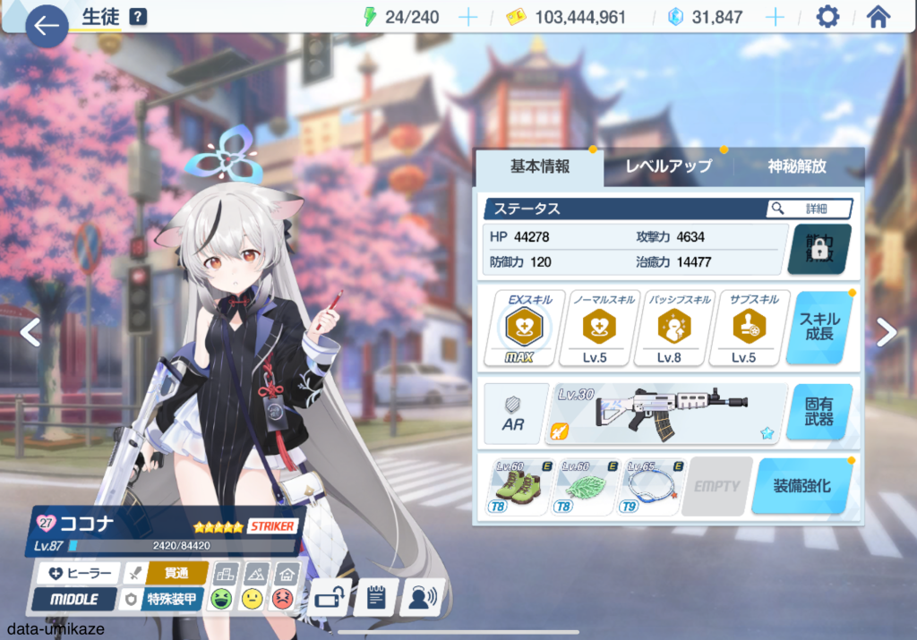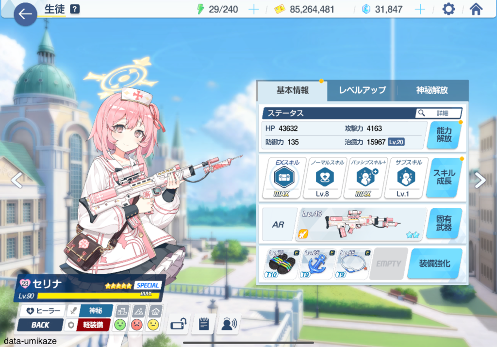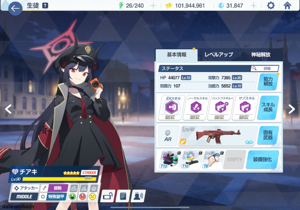 主軸となるのはチアキ。弊シャーレは大決ビナー攻略のためにチアキを固有2まで上げていたのだが、大決戦のビナー、ケセド、シロクロなど休むことなく働いているような印象。振動単体アタッカーとして役割が近いナグサを天井したのはリソース管理の観点では間違いなく失敗だった。彼女も可愛いし強いんだろうけど、育成リソースを割けない。