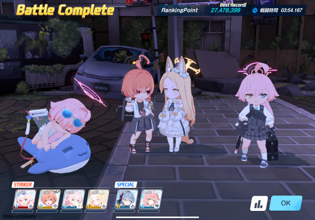 ただ弊シャーレの水着ノノミは星3で止まっているため採用できず、すでに育成素材をつぎ込んでいるドレスヒナに頑張ってもらった。