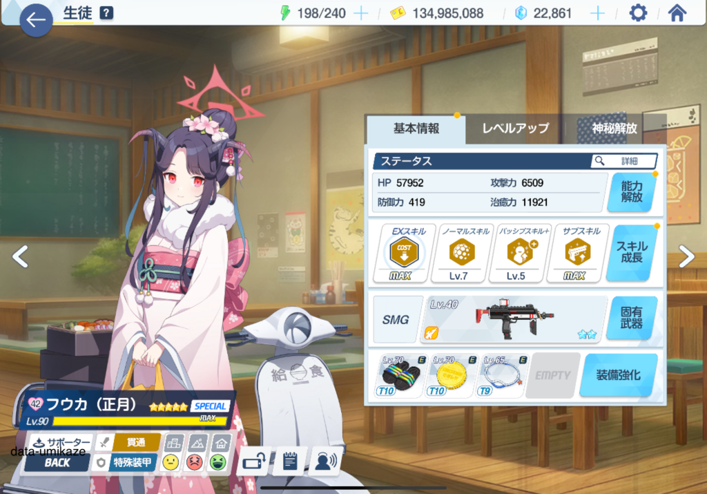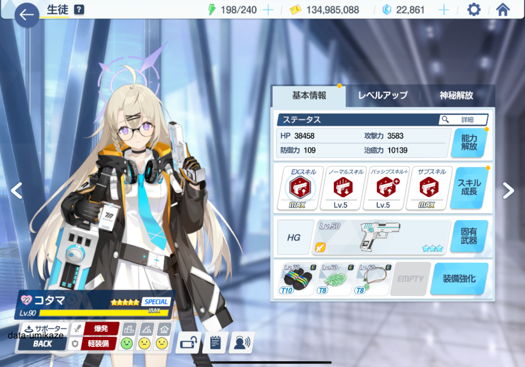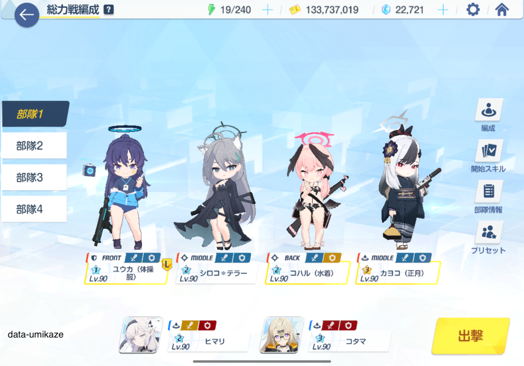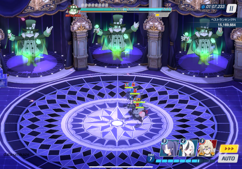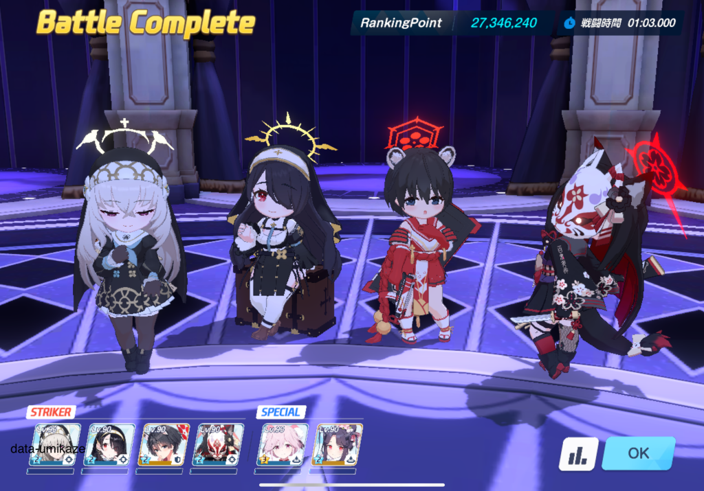 またゴズの前半戦は雑魚敵の攻撃力が高く、シールドを貼るか範囲アタッカーで早急に倒さないと一気に体力が削られてしまう。水着コハルの枠に単体アタッカーを持ってくると突破が安定しないため、難易度を上げる場合は大人しく範囲アタッカーを採用した方がいい雰囲気。